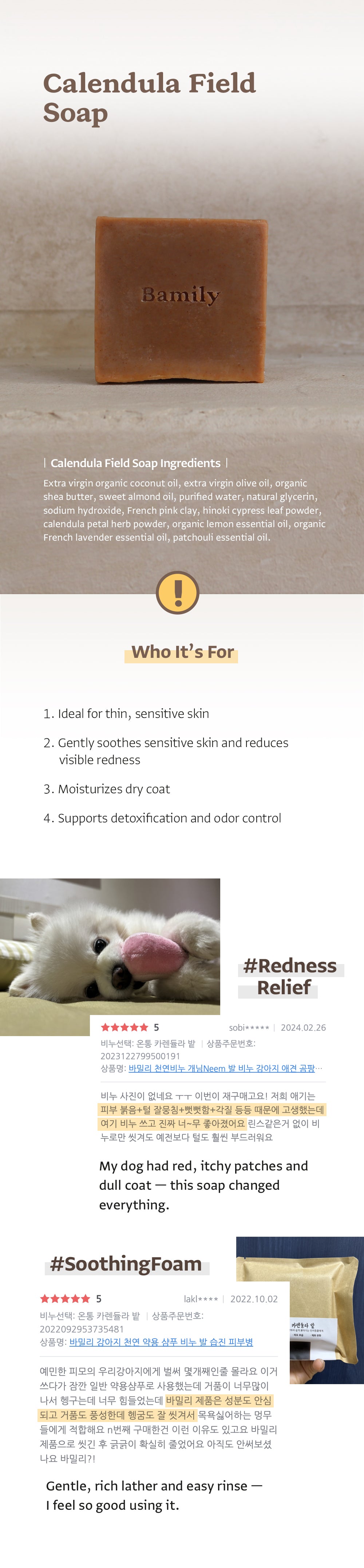 Bamily Calendula Field Soap is crafted with natural ingredients, including Calendula Petal Powder and French Pink Clay, to provide a gentle cleansing experience for pets. Designed for pets with delicate skin, this soap creates a soft lather that helps maintain coat freshness and hydration. Enriched with plant-based oils, it offers a soothing and refreshing bath while keeping your pet’s skin and coat well-nourished.