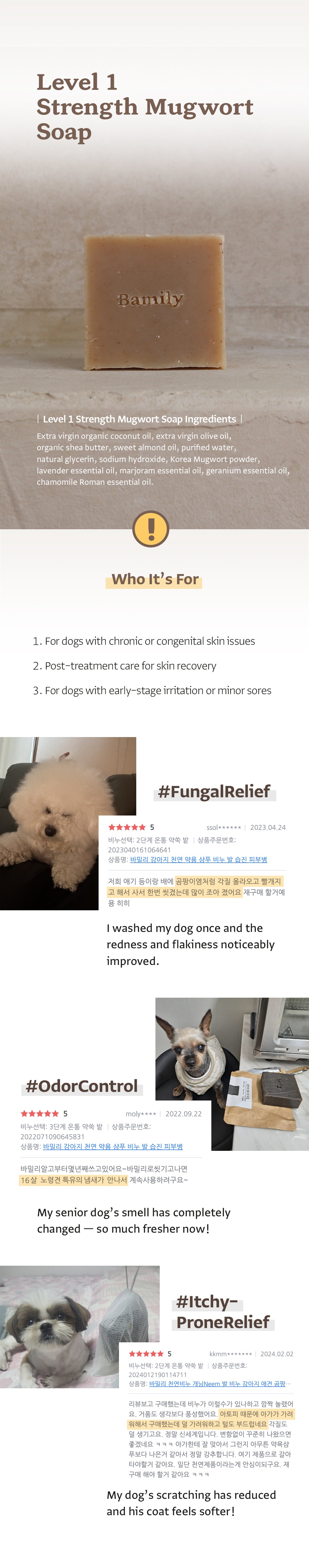 Introducing Bamily Level 1 Strength Mugwort Soap, your go-to solution for your pet's sensitive skin care. This specially formulated soap is designed to offer gentle yet effective cleansing, providing your furry friend with a soothing bath experience. Infused with the natural power of Mugwort and a blend of organic oils, it's the perfect choice for pets with congenital skin issues or those in need of gentle care. Embrace the natural way to maintain your pet's skin health and vitality with Bamily.